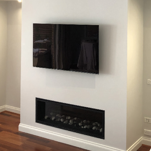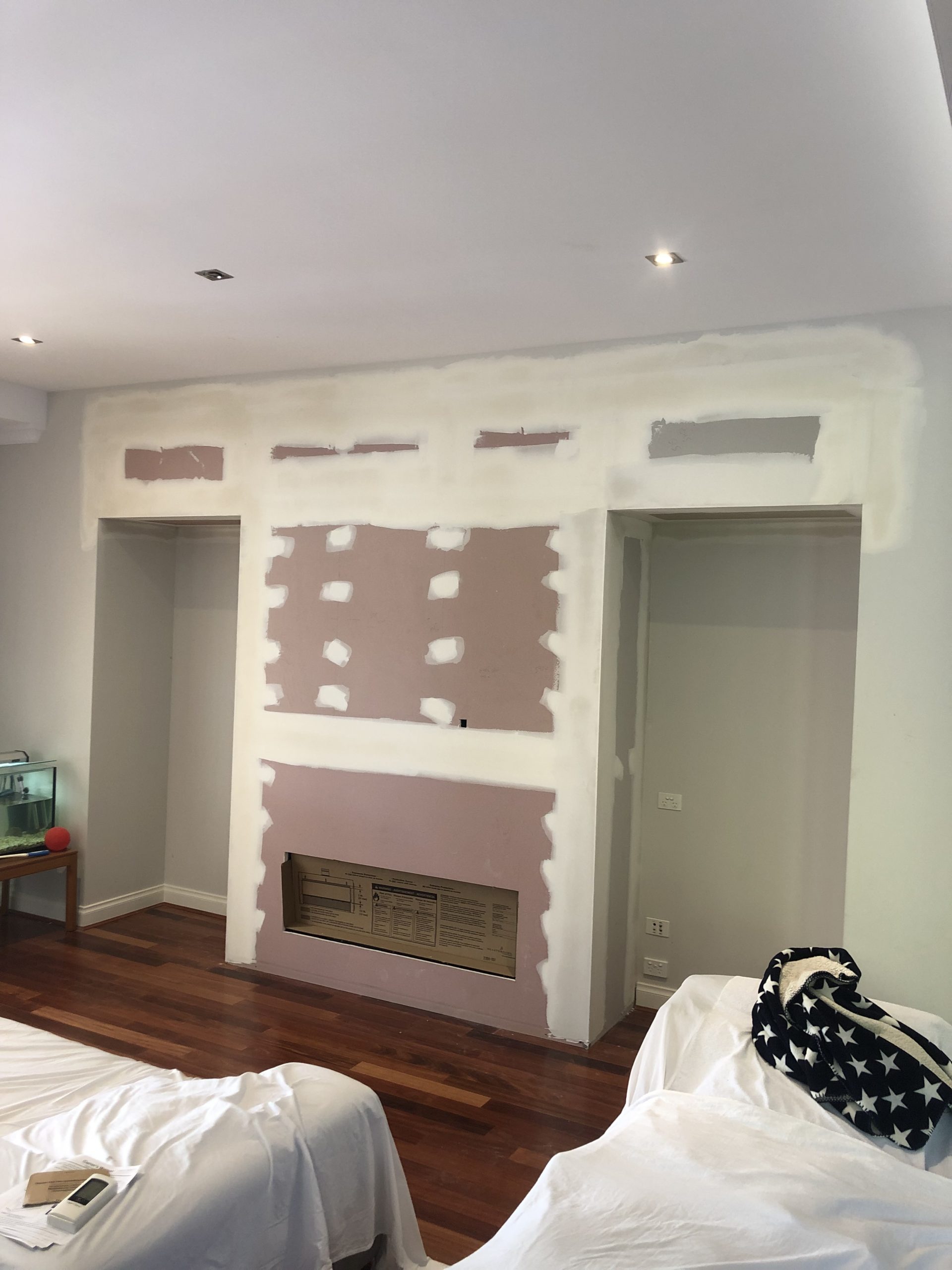 We had to build a bulk head so we could run the flue horizontally to the external wall. To make it all look symmetrical we also built a bulk head on the opposite side. Once all the framing and install was complete, all electrical first fix was done including some extra lighting. Framework and bulkheads were sheeted and flushed and new skirtings installed, all ready for the painters.Once painted, the heater was commissioned and the fascia installed ready for use.
