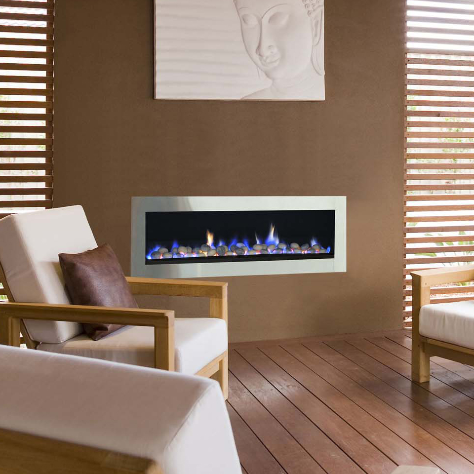 Available with stainless steel, black or painted fascia options and comes in the following sizes – 700, 850, 1100, 1500 and 2000. Select from pebbles, coals or logs.
